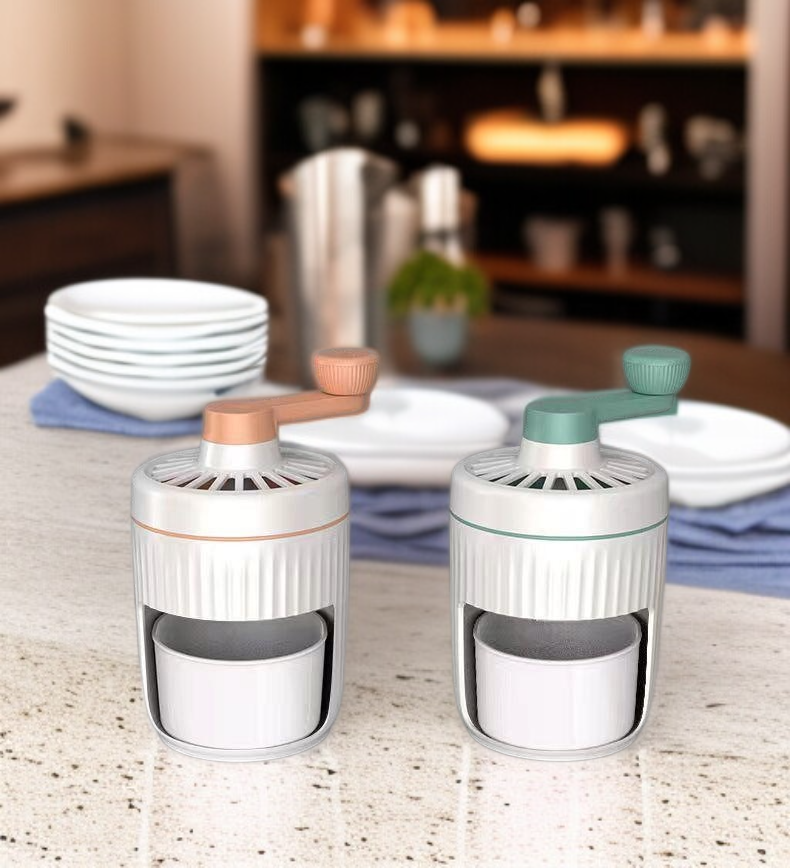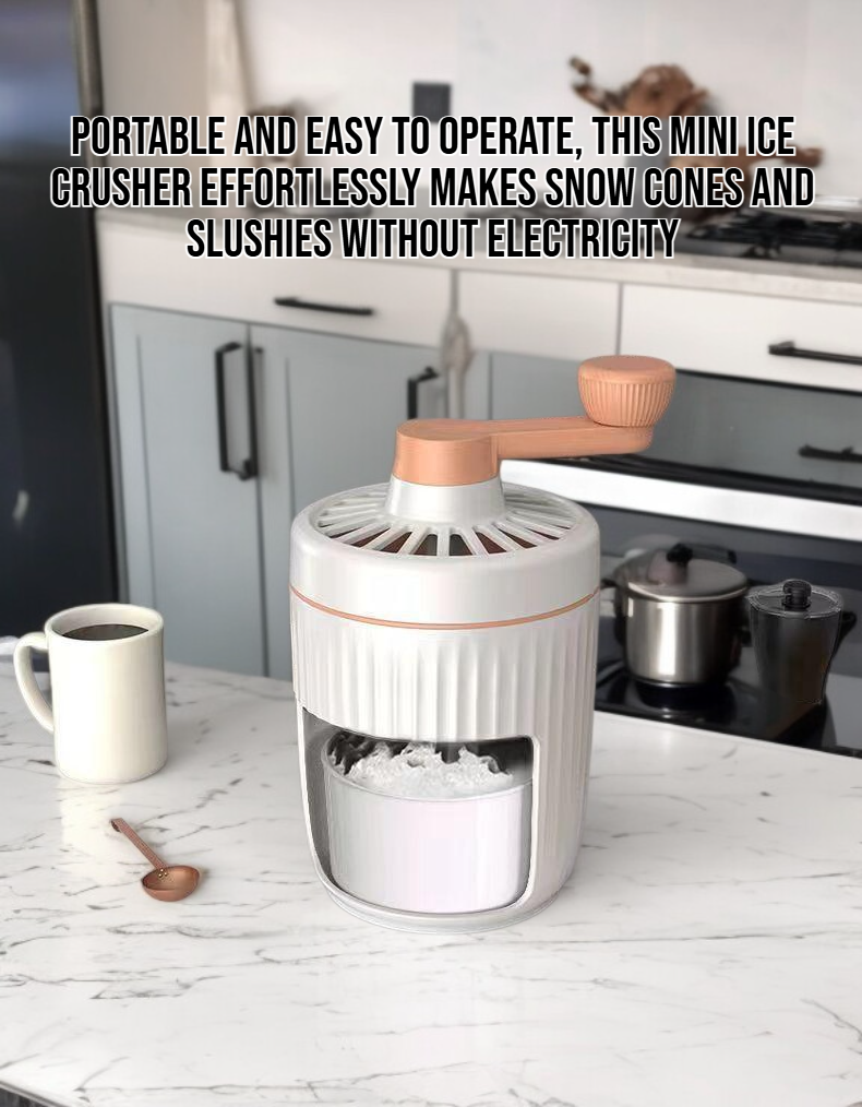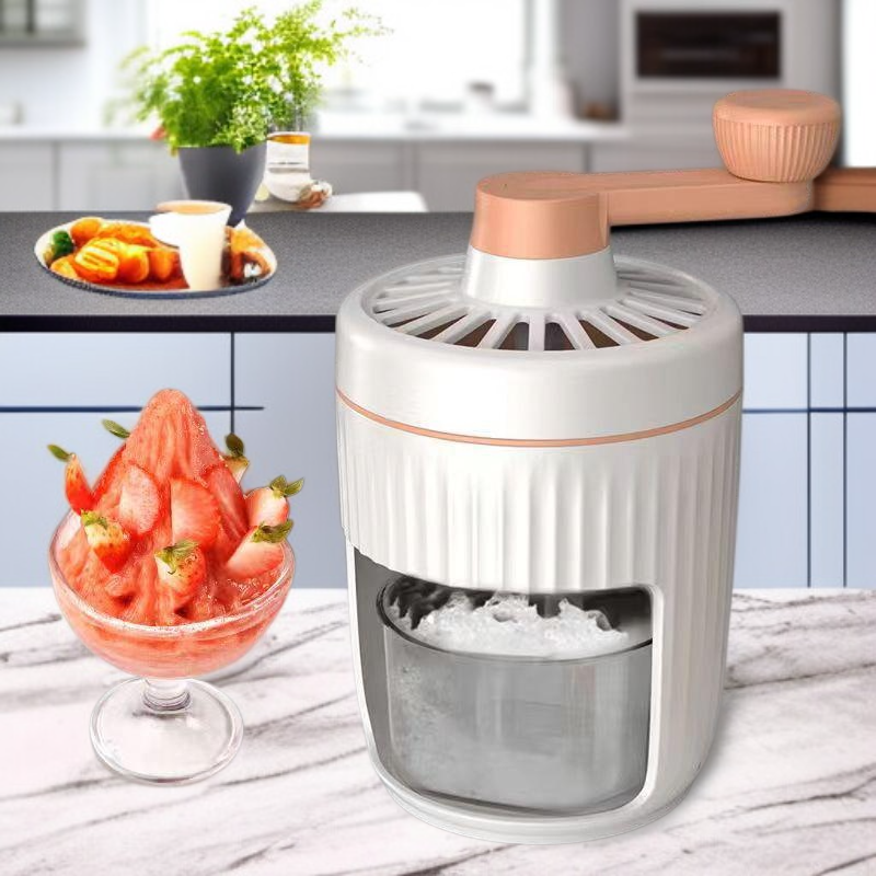 Compact design fits any kitchen; transparent body for easy ice monitoring; efficient hand operation; ideal for quick homemade shaved ice; easy to clean; perfect for summer treats.
